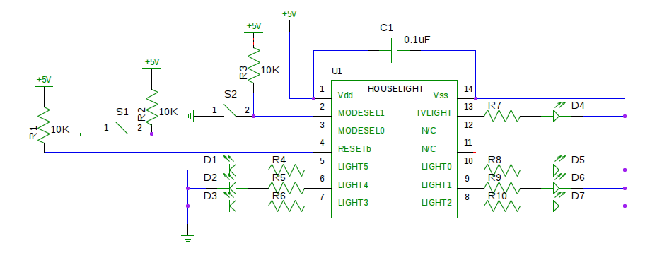 D1,D2,D3,D5,D6,D7 are the white LED outputs for the house lighting. D4 is the blue LED that simulates someone watching TV. R4 to R10 should be selected to limit the current in the LEDS to less than 20mA.