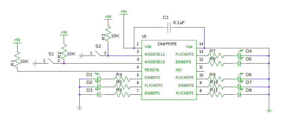 This circuit provides a total of 4 independent flickering LED campfires all controlled by the same microcontroller chip. Each campfire had two LED outputs . One for a yellow LED that provides the flicker, and one for a RED LED that provides a glowing and pulsating ember type effect.