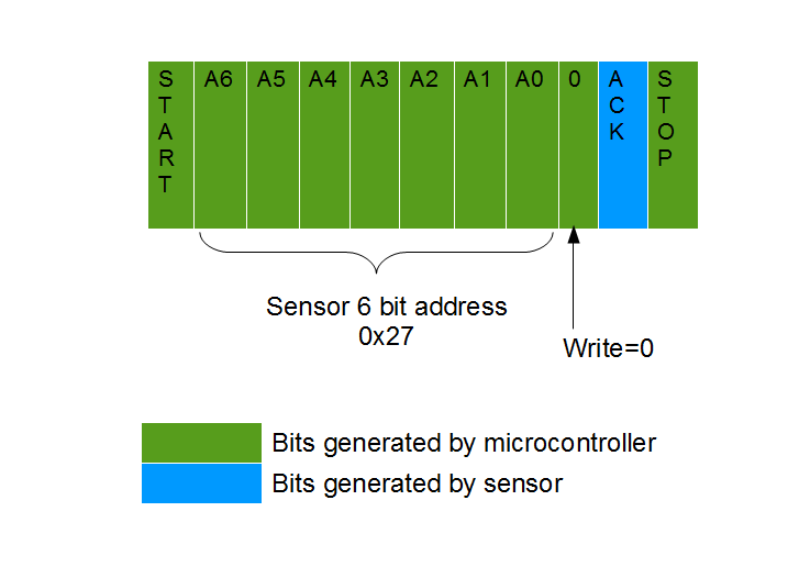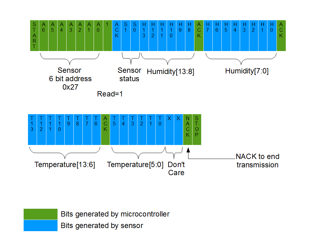To read the humidity and temperature data we initiate an I2C register read to the sensor address of 0x27. Therefore, we need to send a 0x4F over the I2C bus to indicate to the sensor we want to read the humidity and temperature result.