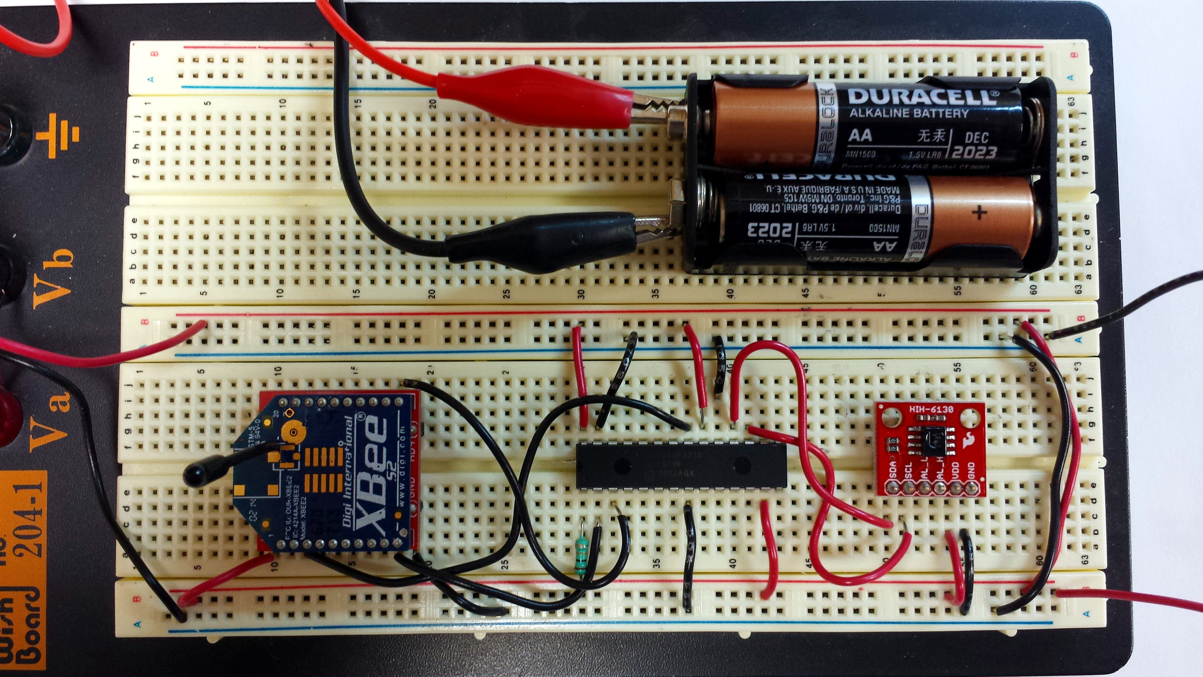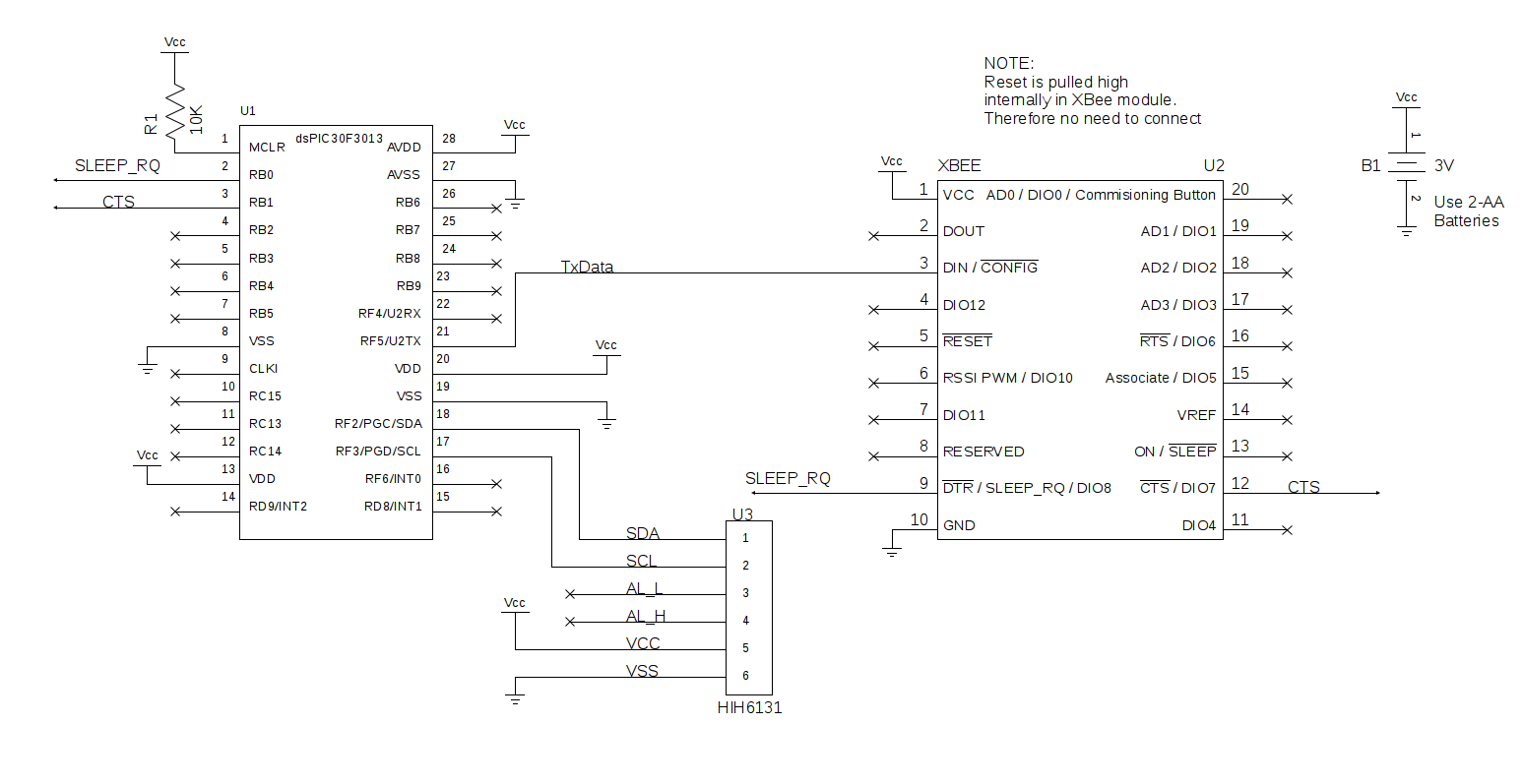 Now we will build the hardware for our first remote sensor. The hardware will be very similar to our wireless link test hardware found in section 5.2. We will need to add the HIH6131 sensor to the microcontroller and XBee setup. The schematic for our temperature and humidity remote sensor is shown in figure 6.4.