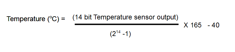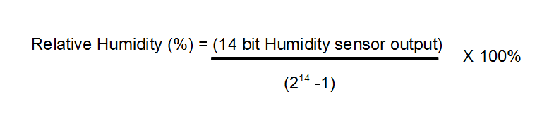 The humidity and temperature data returned are the raw sensor readings. In order to display the humidity as relative humidity between 0% and 100%, and temperature in degrees Celsius, we need to be aware of the equations that convert the raw sensor readings to actual humidity and temperature readings. We will send the raw readings back to the Raspberry Pi to be converted and logged. There is no reason to spend computational power to convert the values in the battery powered microcontroller when we have plenty of processing power on the Raspberry Pi. From the HIH6131 data sheet, the relative humidity is computed as show in equation 6.1 and temperature in degrees Celsius is computed as shown in equation 6.2.