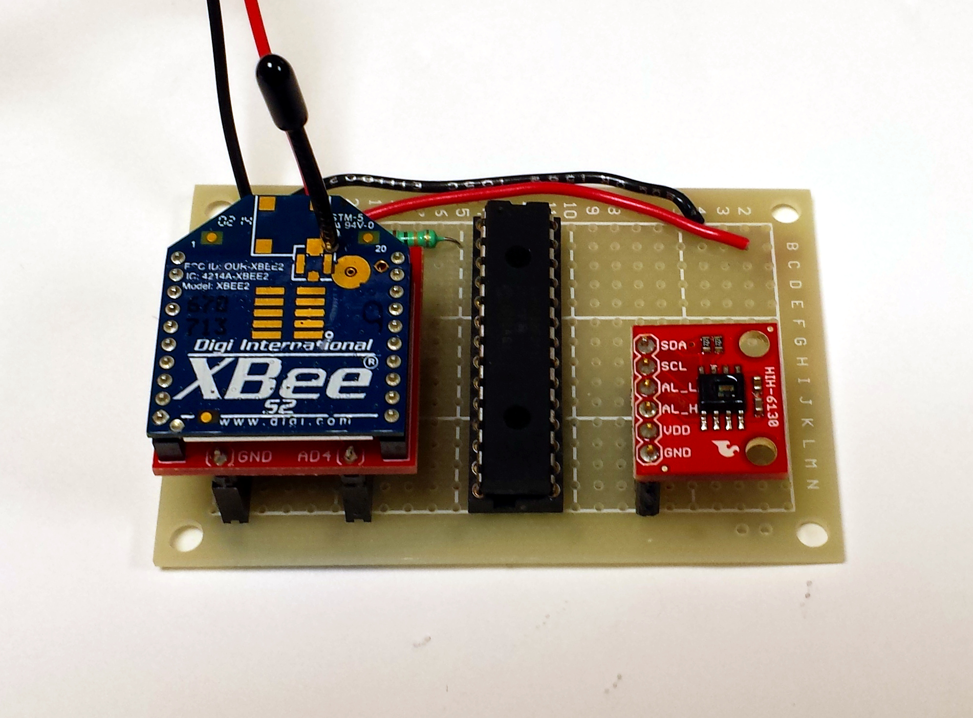 Once the remote sensor unit has been confirmed working on the breadboard, it can then be moved to a prototype perf-board as shown in figure 6.6. Make sure to socket all parts so that it is easy to change out a part. It is also important to make sure that you build the circuit on a PCB small enough to fit in the enclosure that will protect the unit from the elements. A suitable enclosure is a plastic outdoor rated PVC electrical box which is described in detail in section 6.6.
