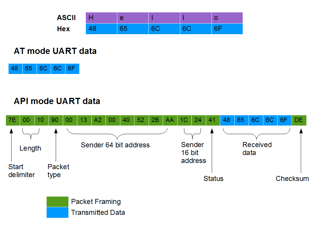 Switching between AT and API mode only affects the format of the data coming out on the UART of the XBee module. It in no way affects the inter network communication between XBees. It is possible to have a mix of AT and API mode devices within a XBee network. Figure 5.4 shows the actual data received by the XBee coordinator in both AT and API mode.