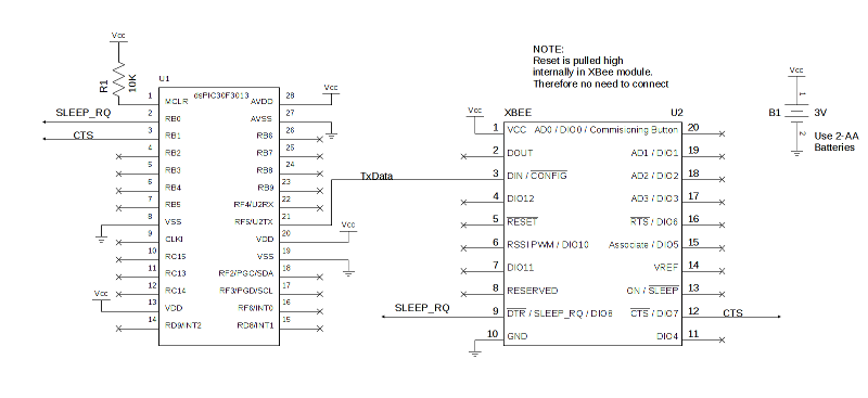 Once the XBee is asleep we will put the PIC microcontroller to sleep by calling the standard sleep function: Sleep();