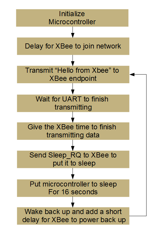 After initializing the UART, we delay a short time to allow the XBee to join up with the coordinator. Next we push the data into the UART. After waiting for the UART to finish transmitting, we will put the XBee to sleep by asserting the pin SLEEP_RQ on the XBee module.