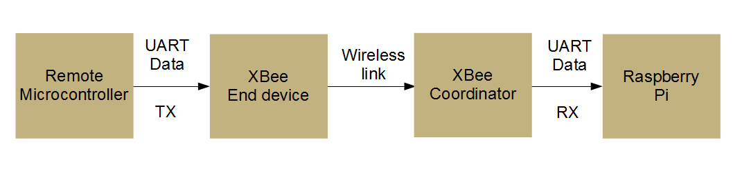 For this test, we will create a small program in the microcontroller and send this data out through the microcontroller's UART to the XBee end device. The XBee end device will then send it wireless to the XBee coordinator. The data will then come out on the XBee coordinator UART, which is connected via the XBee programming adapter to the Raspberry PI USB port. The entire data path is shown in figure 5.1