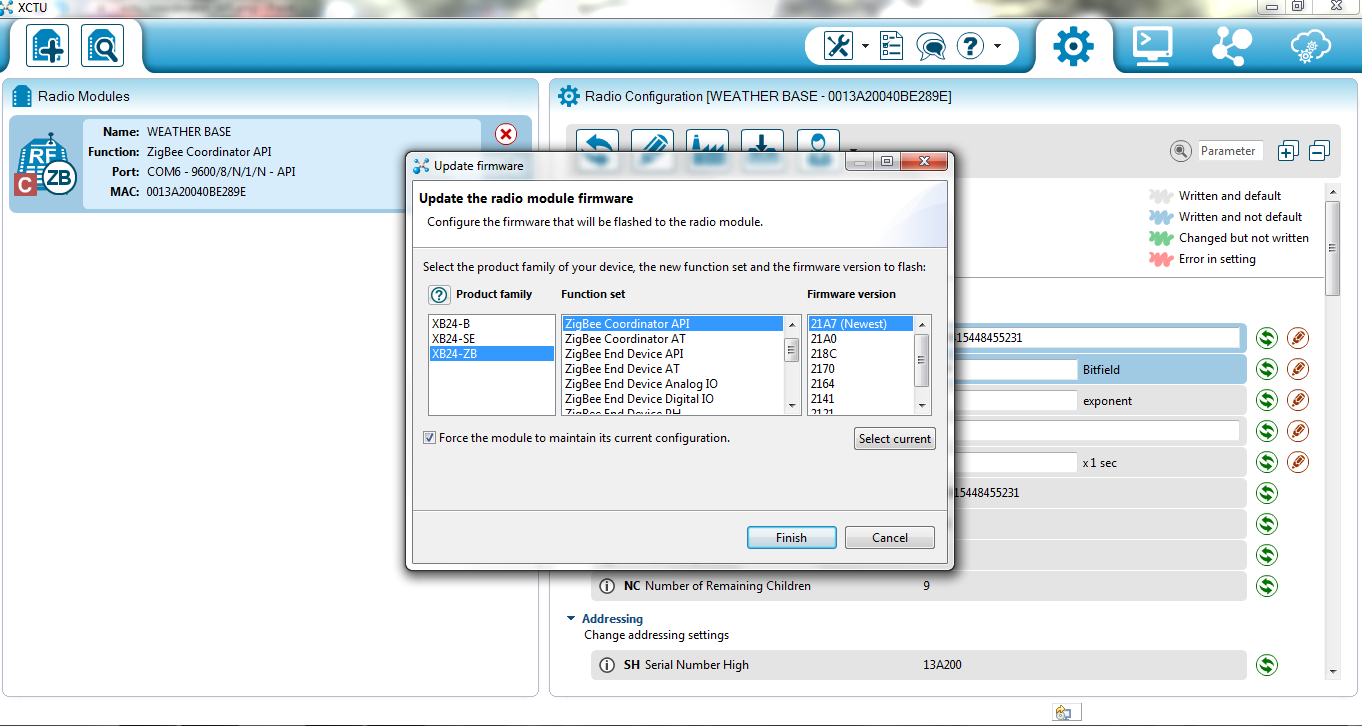 The weather stations sensors can remain in AT mode as they only need to communicate directly to the coordinator. However, we will re-program the coordinator to API mode so that we can see which sensor is sending data by decoding the sensor's address in the API data packet.