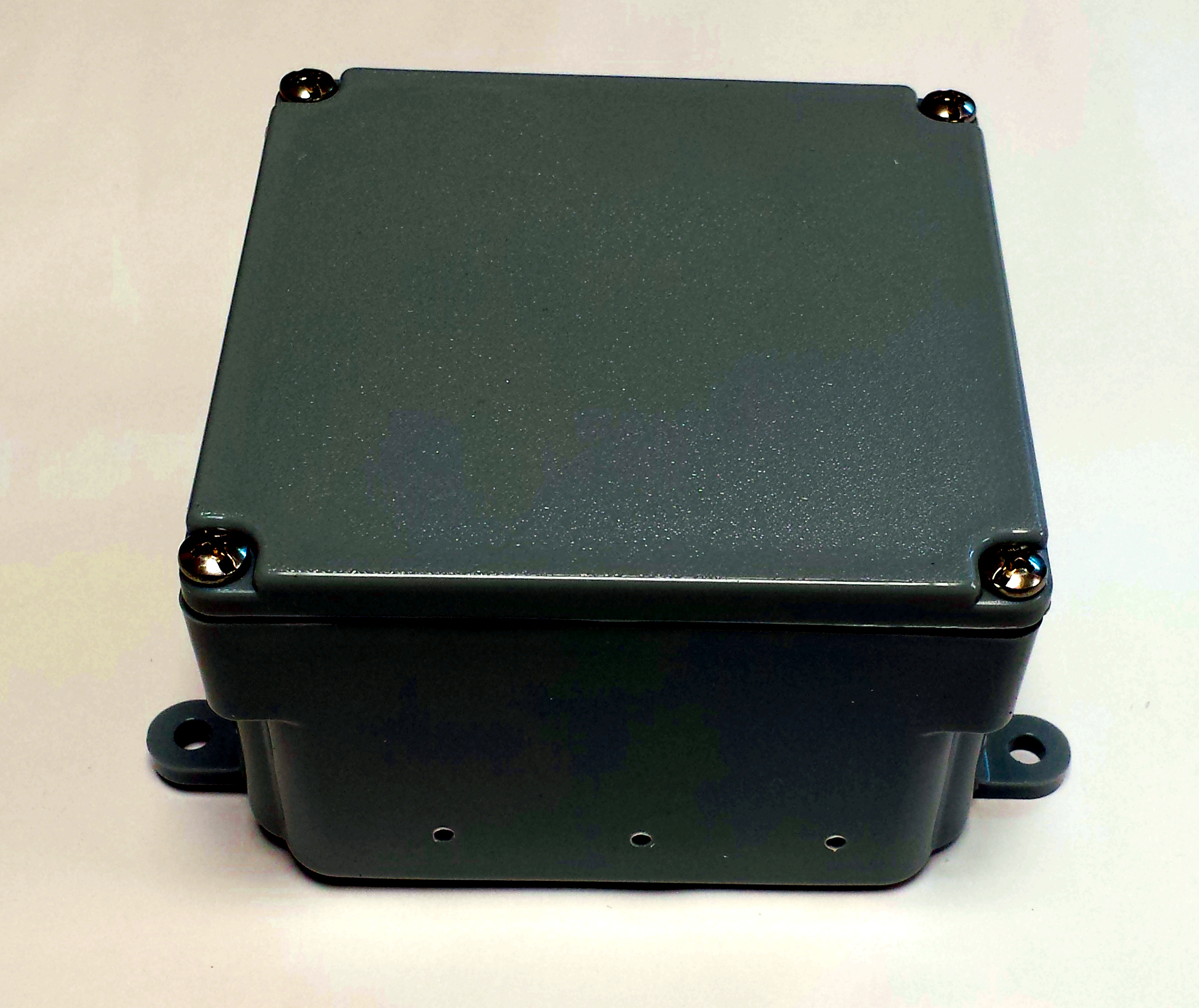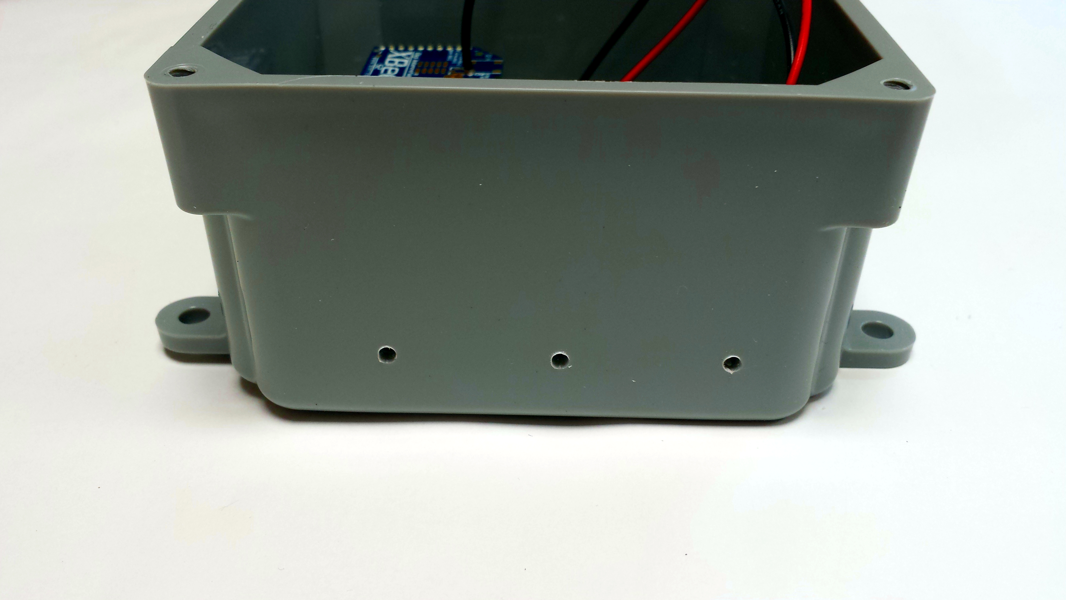 Once the mounting holes for the PCB have been drilled, it's a good idea to drill a couple of extra holes in the bottom of the box for drainage. In the event that water does somehow get inside the box, we want a way for it to get out.