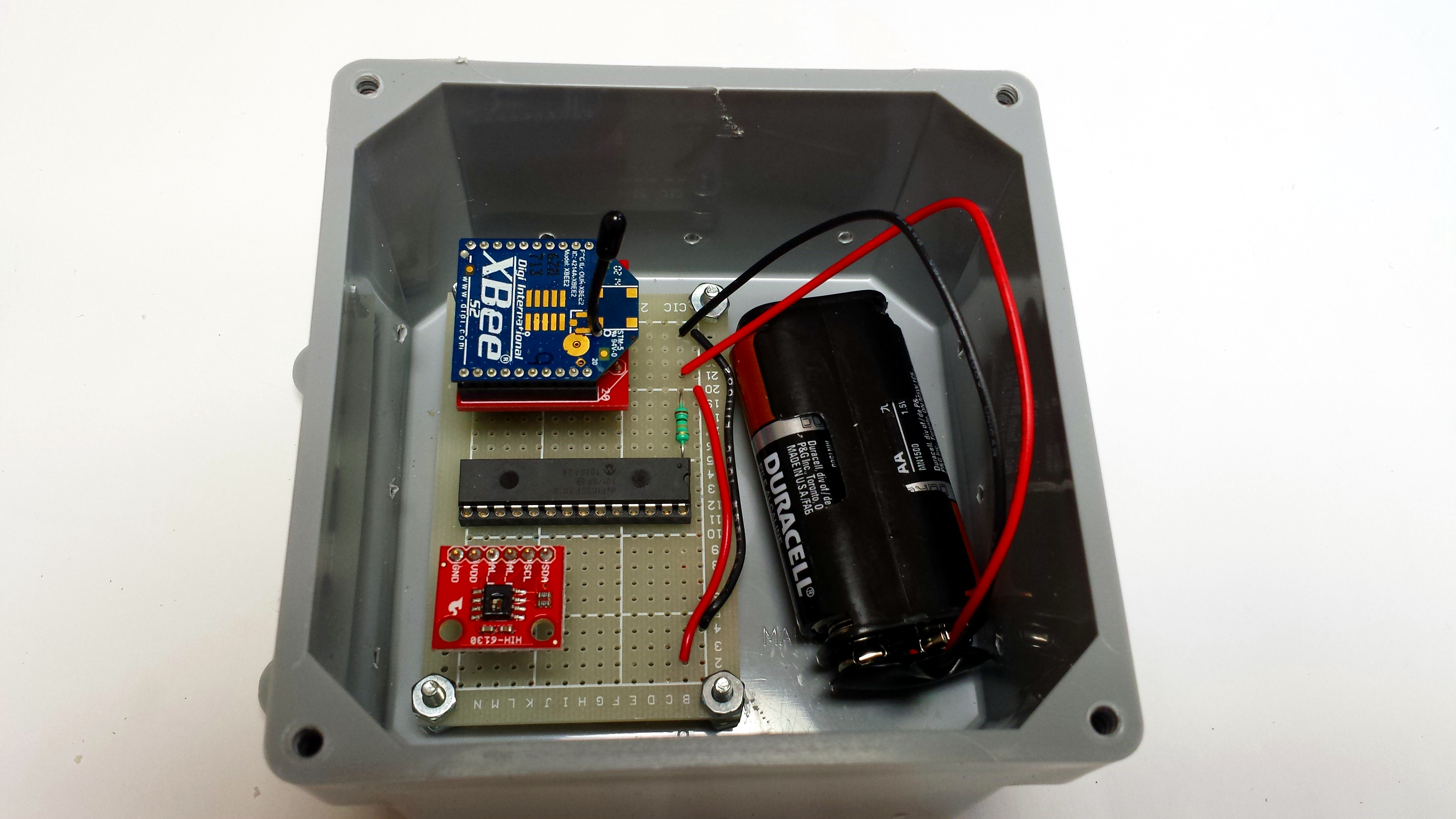 Now that we have the HIH6131 sensor transmitting the humidity and temperature back to the base station, we need to put it in a weatherproof enclosure so that we can safely mount it outside. If you have built the sensor hardware on a breadboard such as in figure 6.5, you will need to build it on a small two inch square prototype board similar to the one in figure 6.6.
