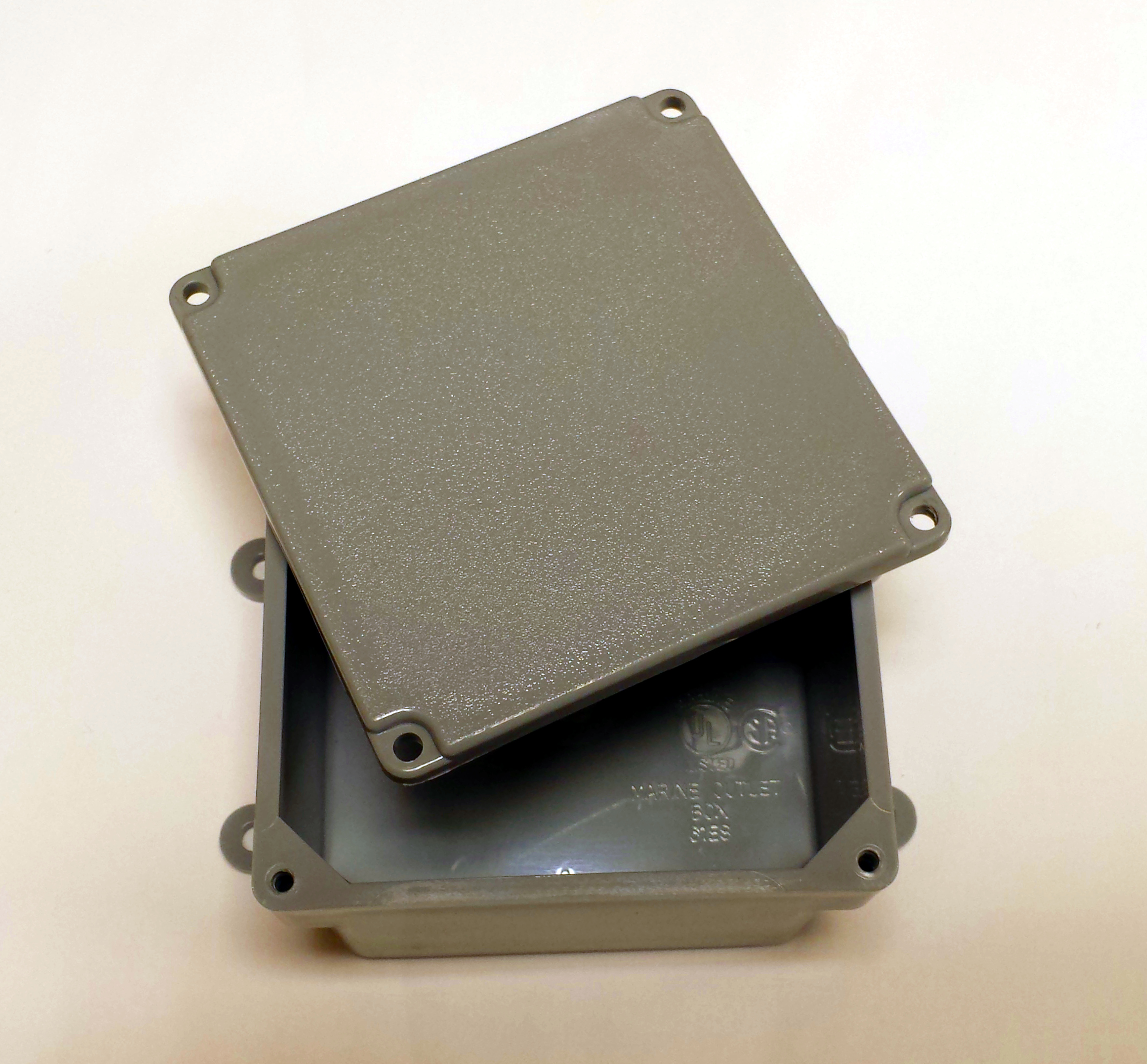 Our enclosure needs to prevent rain and snow from getting on the electronics, but it can't be completely air tight as the humidity sensor needs access to the outside air. We could use a small project box, but past experience shows that these tend to crack and become brittle after being exposed to the weather for an extended period of time. A better choice is to use a outdoor rated PVC electrical box.